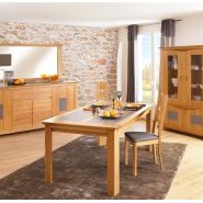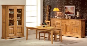 Le style campagnard proposé en couleur chaleureuse avec des tables conviviales : des allonges qui se rangent sous la table, des meubles à portes coulissantes pour une fonctionnalité optimale.